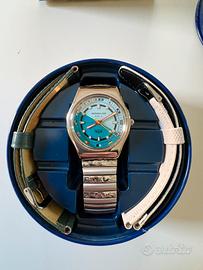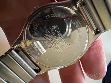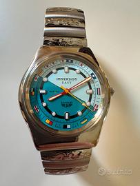 Bellissimo orologio Immersion modello Easy "Stendardo", caratterizzato da un design nautico vivace e iconico. L'orologio è un pezzo versatile, perfetto sia per il tempo libero che per gli amanti dello stile marino. NUOVO, MAI INDOSSATO e ancora con la pellicola protettiva originale applicata sul quadrante/vetro (visibile in foto). Caratteristiche principali: • Quadrante: Design "Stendardo" con bandiere nautiche colorate come indici. • Movimento: Japan Movement (al quarzo), affidabile e preciso. • Resistenza all'acqua: WR 50 Metri. • Cassa: In metallo con fondello in acciaio serrato a scatto. • Design: Esclusivo registrato "Stendardo Italy". Cosa include il set: 1. Orologio montato con bracciale in acciaio estensibile (molto comodo). 2. Cinturino aggiuntivo 1: In pelle verde scuro. 3. Cinturino aggiuntivo 2: In tessuto tecnico bianco (stile "nylon" o "sailcloth"). 4. Packaging originale: Scatola esterna in cartone e iconica latta blu circolare con immagine subacquea (razza) Perché sceglierlo: • Design Unico: Quadrante bitonale (azzurro/verde acqua) con indici a bandiera. Un pezzo che non passa inosservato. • 3 Look in 1: Il set include il bracciale in acciaio estensibile (molto vintage-chic), un cinturino in pelle verde bosco e uno in tessuto tecnico bianco. Li cambi in un attimo per adattarli al tuo outfit. • Qualità Garantita: Movimento giapponese affidabile, cassa in metallo resistente e impermeabilità fino a 50 metri (5 ATM). • Full Set: Arriva con la sua scatola originale, la bellissima latta blu da collezione e il copriscatola esterno.