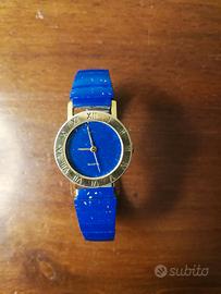 Orologio al quarzo con cassa e cinturino in lapislazzuli con inclusioni di metallo brillante, che sembra oro ma non sono sicuro.