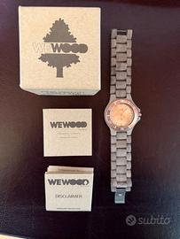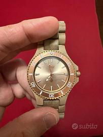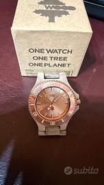 Orologio unisex al quarzo, mai indossato e in condizioni pari al nuovo, con pellicola protettiva ancora presente sulla cassa. Realizzato interamente in legno, presenta un quadrante da 42 mm di diametro. Non presenta segni di usura, graffi o ammaccature. Completo di scatola originale..