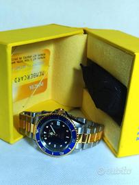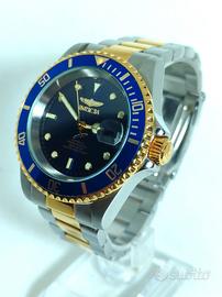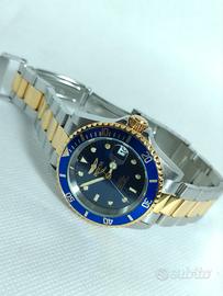 Un diver con l’anima del mare e il carattere dell’acciaio. L’Invicta Pro Diver Automatic ref. 89280B è il compagno ideale per chi ama il fascino dei grandi classici, ma non rinuncia a un tocco di luce dorata. Quadrante blu profondo, lunetta cerulea, dettagli oro su corona, indici e bracciale: un contrasto perfetto tra eleganza e sportività. All’interno, il movimento automatico Seiko NH35A sinonimo di precisione e affidabilità, visibile dal fondello trasparente. In buone condizioni generali, con segni d’uso coerenti con l’età del segnatempo. Cassa in acciaio da circa 40 mm, vetro con lente ciclopica in buono stato, fondello e corona a vite, guarnizione fondello sostituita di recente. Pulito e curato, pronto a vivere nuove giornate al polso. Completo di scatola e card originali (scatola vissuta, cuscino after). Un orologio onesto, brillante, e soprattutto emozionante da indossare. Perché l’importante non è quanto costa… ma quanto ti fa battere il cuore. Oggetto facente parte della mia raccolta privata. Non conosco la data della ultima revisione. La WR dichiarata dalla casa costruttrice, nei vintage, durante gli anni può aver subito variazioni quindi sempre meglio chiedere info in merito ed evitare di bagnare l'orologio volontariamente. Chiedi la misura del cinturino per essere sicuro ti vada bene. Se non diversamente indicato l'oggetto viene venduto senza scatola e libretti. Le foto sono parte integrante dell'annuncio. Non sono ammessi resi, solo se l'oggetto non corrisponde a quello venduto in foto. Chiedi sempre prima di acquistare, tuteliamoci entrambi. Vendita occasionale e non professionale. Non viene emessa fattura ai sensi dell’art. 67, comma 1, lettera i) del T.U.I.R. Cessione tra privati, senza finalità di lucro.