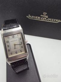 Bellissimo orologio Jaeger LeCoultre modello Reverso referenza 140.250.8 portabile sia da uomo che da donna, con quadrante in argento 23x38 millimetri, cassa in acciaio, movento al quarzo, vetro zaffiro e numeri arabi. Cinturino in pelle e chiusura non originali.