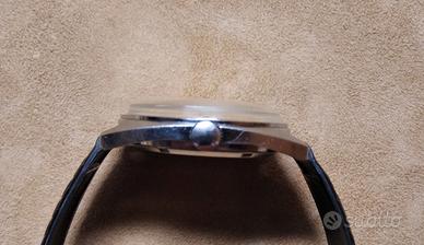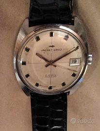 Orologio Jaquet Droz (ora presente solo in alta gamma) anno 1964, diametro mm. 35 corona esclusa. Antibloc, antimagnetico, resistente ad acqua, che col vetro e la cassa sono intatti. Datario ben funzionante, fondello 7017. Revisionato a dicembre 2025 con molla di carica nuova. Movimento molto preciso da 17 rubini AS (A. Shild 6325 poi ETA) a carica manuale. Note storiche e info: Jaquet Droz invento' nel 1775 gli automi: uno scrive, l'altro suona, l'altro da' l'ora esatta; esposti al Museo d'Arte di Neuchatel. Il movimento AS lo montava pure Perregaux. Quadrante bianco coevo con indici applicati alle ore, lancetta secondi centrale, lancette o sfere a bastone con contrappeso. Cinturino sub nero mm. 18 alle anse con gancio ardiglione, per polsi circonferenza da cm. 16 a cm. 20., più un altro in pelle omaggio. Spedizione in doppia busta imbottita raccomandata A.R. euro 10 postale, entro un giorno lavorativo da ricevimento bonifico o con Tuttosubito. Invio foto e numero ricevuta per la tracciabilita'. Altre foto disponibili. Grazie.