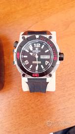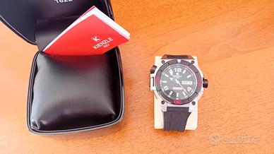 Vendo imponente orologio Kienzle 1822 Ares... orologio al quarzo con movimento giapponese.... robusta cassa in acciaio da 45/50 mm... ghiera nera con inserti rossi... indicazione day-date ore 3... w.r. 1000 metri... valvola espulsione dell'elio... corona e fondello a vite... indici e sfere luminescenti.... vetro minerale piatto... cinturino silicone nero... con scatola e documenti.... ottime condizioni... solo alcuni piccoli segni su fondello...