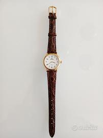 Vendo orologio vintage del marchio tedesco Kienzle, modello al quarzo caratterizzato da una cassa rotonda dorata, un quadrante bianco con numeri arabi neri e un cinturino in pelle marrone con stampa coccodrillo. In perfette condizioni.