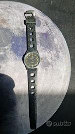 L’orologio è dotato di quadrante nero originale con indici e sfere luminescenti, ghiera girevole esterna, datario a ore 3
