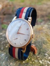 Dimensioni cassa 36 MM, anse 18 MM, fondello in acciaio ossidabile, cassa placcata oro. Revisionato, perfettamente funzionante e controllato sulle 24 ore. Cinturino in tessuto multicolore come da foto, facilmente cambiabile. Ottime condizioni, come da foto.