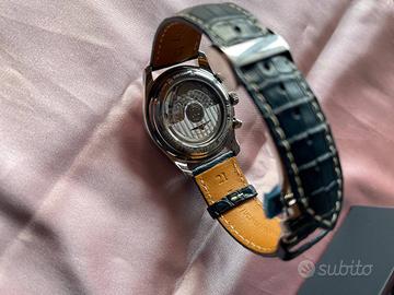 Blu con riflessi cangianti, l'orologio è decisamente versatile in quanto è possibile utilizzarlo sia in occasioni eleganti che più informali, essendo anche un cronografo.
