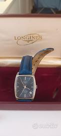 Longines degli anni '70 movimento automatico con datario cassa in acciaio quadrante blu cinturino in pelle blu.