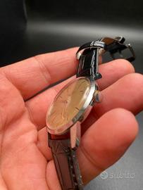 Bellissimo Longines vintage, la referenza lo colloca fine anni ‘40. Perfettamente funzionante, ottime condizioni. Movimento meccanico a carica manuale Longines cal. 1268z. Dial con bella patina champagne, indici a tacche e sfere dorati. Piccoli secondi ad ore sei. Cassa in acciaio inossidabile da 35 mm. escluso corona. Fondello a scatto. Cinturino nuovo in pelle nero con fibbia logata Longines. Orologio pronto per essere indossato, ottima tenuta del tempo e della carica!!!!