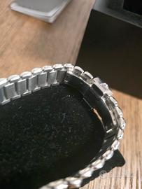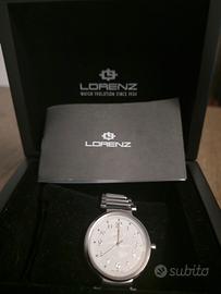 L'orologio viene spedito con scatola originale e libretto di garanzia e certificazione delle pietre preziose. L'orologio non è mai stato indossato. Presenta le pellicole protettive e una stupenda cassa in acciaio inossidabile da circa 30-32 millimetri. Il vetro sopra la cassa è in zaffiro antigraffio e resiste fino a 50 metri sotto acqua (5 ATM). Il movimento è prodotto in svizzera e il quadrante presenta una lavorazione guillochè al centro e i numeri arabi neri ben leggibili ai lati. Il prezzo originale (non più in vendita) è di circa €350. L'orologio è in ottime condizioni estetiche, ma la batteria è attualmente esaurita. Bisogna cambiarla presso un centro autorizzato Lorenz per avere anche l'impermeabilità. Prezzo trattabile.