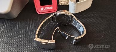 Come da foto reali, orologio cronometro made in Japan, LORUS movimento Seiko V657, quadrante bianco e cassa con cintolino integrato in acciaio. Completo di maglie di ricambio e confezione originale. Vetro perfetto, sottocassa e bracciale con normali micro segni di usura. Batteria nuova appena sostituita.