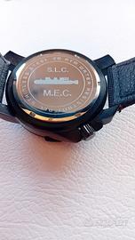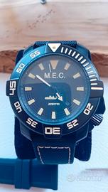 Vendo orologio M.E.C. Slc modello Incursore .... orologio al quarzo Miyota con cassa in acciaio con trattamento PVD nero da 45 mm. e 15 mm. di spessore... data tra ore 4 e 5.... corona a vite a ore 4 con rilievi di protezione.... ghiera girevole unidirezionale.... indici in luminova... w.r. 200 metri.... fondello a vite.... corona e chiusura logate.... cinturino in cordura... mai indossato... tributo ai sommozzatori della Marina e ai loro S.L.C. .... venduto con scatola e card e espositore personalizzato ... in più secondo cinturino in pelle nera non M.E.C. e strumento per cambiarlo...