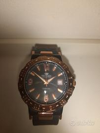 orologio mai usato ,Pryngeps Milano 1956 Timonier Presenta una cassa color oro rosa e un cinturino in gomma nero, con quadrante nero e indici e numeri color oro rosa.
