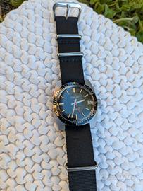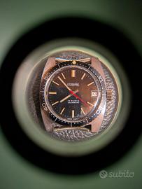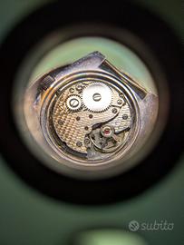 Splendido esemplare di orologeria svizzera A. Marchand (La Chaux-de-Fonds), un autentico pezzo di storia "New Old Stock" degli anni '70, preservato nel tempo e pronto per essere indossato. Rarissima opportunità di acquistare un "time capsule" svizzero pari al nuovo. Scheda Tecnica: Produttore: A. Marchand (La Chaux-de-Fonds, Svizzera) Modello: Skin Diver Vintage Diametro Cassa: 35 mm (esclusa corona) Movimento: Meccanico a carica manuale Calibro FHF 96-4 (17 Rubis, Incabloc) Quadrante: Nero matt con indici al trizio e sfera dei secondi rossa "Sport" Stato: NOS (New Old Stock). Fondo di magazzino mai indossato. Condizioni estetiche impeccabili, cassa mai lucidata con spigoli vivi originali. Cinturino: Montato un nuovo cinturino NATO nero, robusto e confortevole, che esalta il carattere sportivo e vintage di questo diver. Interventi e Verifiche eseguiti: Nessun intervento eseguito per preservare lo stato NOS Nessuna regolazione effettuata per preservare lo stato NOS Movimento: Ispezione tecnica del calibro FHF 96-4. Meccanica originale, pulita e priva di ossidazione. Intonsa mai toccata da nessuno. Cassa: Pulizia conservativa manuale per preservare l'integrità delle finiture di fabbrica. Vetro: Plexiglass originale d'epoca, intonso. Fondello: Preservato con micro-segno originale da stoccaggio decennale (non lucidato per scelta collezionistica). Test Tecnico: Verifica al cronocomparatore con ottimi risultati: marcia di +13s/d, ampiezza e beat error stabili. Immagine timegrapher allegata. Saved & Restored by RE-TIC RE-TIC: Rescue the Beat RE-TIC nasce dalla mia passione di hobbista orologiaio con una missione precisa: salvare la storia dimenticata. Esistono migliaia di orologi vintage, pezzi meccanici onesti e ricchi di fascino, che rischiano l'abbandono solo perché non sono considerati "di lusso". Io li scovo, ne verifico l'integrità e restituisco loro la dignità di battere ancora. Vendita tra privati con formula 'visto e piaciuto'.