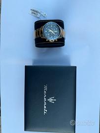 [Materiali] Maserati SFIDA Orologio da uomo, in acciaio, ip yg, con cinturino in acciaio e fibbia deplojante con pulsanti [Funzioni] Orologio analogico con movimento al quarzo e funzione cronografo [Caratteristiche] La cassa dell'orologio misura 44mm, con spessore 11,40mm. Il quadrante sunray blu si compone di un vetro minerale [Impermeabilità] L'orologio ha una resistenza all'acqua fino a 10 ATM [Packaging] Confezione originale Maserati e garanzia 2 anni