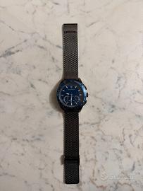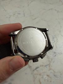 Vendo splendido cronografo Maserati originale, collezione Traguardo (Ref. R8873612009). Un orologio di grande impatto che unisce il prestigioso design italiano alla precisione della meccanica giapponese. Caratterizzato da una cassa robusta con finitura IP Gunmetal (canna di fucile) e un quadrante blu profondo con ghiera tachimetrica coordinata. CONDIZIONI E FUNZIONAMENTO: Stato: Ottime condizioni. Indossato meno di 10 volte totali. Funzionamento: Perfettamente funzionante in ogni sua parte. Cronografo preciso e reset delle lancette impeccabile. Estetica: Vetro minerale intonso, nessun graffio su cassa o cinturino. DOTAZIONE: Viene venduto completo di scatola originale Maserati (perfetta anche per un regalo). SCHEDA TECNICA: Movimento: Quarzo di alta precisione Miyota JS50 (affidabilità Citizen). Dimensioni: Diametro 55x45, (diametro maschile e sportivo). Cinturino: Maglia Milano in acciaio color canna di fucile con chiusura Clip & Hook (regolabile facilmente in autonomia, non servono attrezzi particolari). Impermeabilità: 10 ATM (100 metri) con corona a vite, protezione superiore contro l'acqua. Visibilità: Lancette e indici luminescenti per una lettura perfetta anche al buio. NOTE: La finitura satinata "canna di fucile" è molto più ricercata e moderna rispetto al classico acciaio. Un pezzo sportivo ma estremamente elegante al polso.