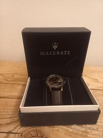 Vendo orologio da uomo di maserati della collezione eleganza. Modello realizzato in acciaio e cuoio, con tre lancette e datario a ore tre. La cassa ha dimensione di 42 x 51,5 mm con finitura acciaio lucido, quadrante di colore sunray grigio e verde e vetro minerale. Orologio con bracciale in pelle di colore nero e fibbia ardiglione. La resistenza all'acqua è di 5 atm. Movimento mvt. Vj42b11 stem h3 date h3. La referenza è r8851130001