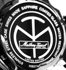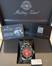 Fantastico orologio Mathey Tissot,cassa in acciaio inox 316L di 42mm.vetro zaffiro,ghiera unidirezionale in ceramica nera con numeri in bianco. Dial di un rosso bordeaux con inseri e la cette con bialco luminoso,corona e fondello serrati a vite WR 300mt. L’orologio è swiss made con un prestigioso movimento automatico calibro Landeron 24, raro di alta qualita e di derivazione ETA. con 26 rubini e 44 ore di riserva di carica. L’orologio è full sett con garanzia di 2 anni e non è stato mai polsato.