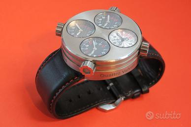 Stupendo orologio prodotto da MECCANICHE VELOCI, modello QUATTRO VALVOLE (lo stesso modello che indossava Cristiano Ronaldo), numero 24/100, cassa 48 mm. in Titanio, con quattro quadranti e quattro movimenti meccanici indipendenti ETA 2671 a carica automatica, corone in titanio e cinturino in pelle, vetro in zaffiro con trattamento antiriflesso. Impermeabile fino a 5 Atm.