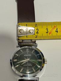 Orologio meccanico stile vintage Atlantic originale Swiss Made, modello 17 Jewels Shock Proof. Quadrante verde sfumato con indici applicati e cassa in acciaio. Movimento a carica manuale perfettamente funzionante. Cinturino nuovo in pelle. Ideale per chi cerca un orologio elegante