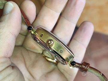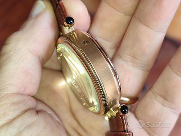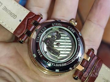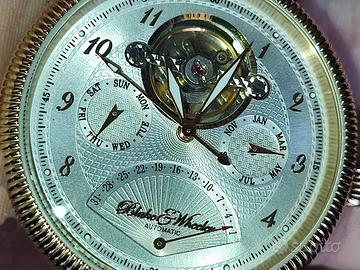Vendo splendido orologio da uomo con movimento di precisone con movimento a vista, cassa placcata in oro con fondo in cristallo minerale per permettere la visione del meccanismo. Quadrante: Color argento con indici per il mese e il giorno della settimana (calendario completo). Cinturino: In pelle con stampa coccodrillo, lunghezza circa 25 cm. Dimensioni: Diametro della cassa di circa 42 mm e spessore di circa 10 mm. Resistenza all'acqua: 5 ATM (50 metri). Peso: Circa 88 g. Per qualunque domanda contattami.