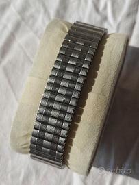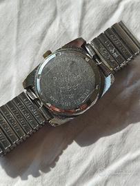 Orologio meccanico vintage Phigied Mec con datario, cassa in ottone cromato e bracciale elastico in acciaio. L'orologio funziona bene, ma non conosco la data dell'ultima revisione. La cromatura e' danneggiata nella parte superiore della cassa come visibile in foto. Diametro cassa 32mm circa