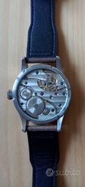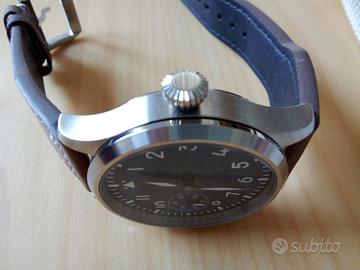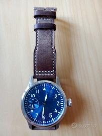 Orologio meccanico no-brand (cioè non ha marchio) con movimento a carica manuale 17 rubini ore-minuti e secondi sulle 9 (è una versione cinese dell'UNITAS 6497) cassa in acciaio inox 42 mm di diametro, corona a scatto, vetro minerale, fondello a vite trasparente, cinturino in cuoio marrone.