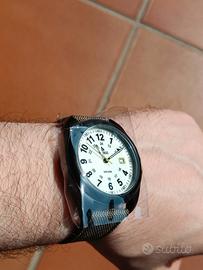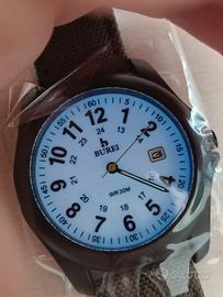 Il BUREI Military Field Watch è pensato per chi cerca un orologio pratico, resistente e immediato da leggere in ogni situazione. La cassa nera dal design pulito si abbina al quadrante bianco ad alto contrasto, con doppia scala 12/24 ore in stile militare: chiaro, funzionale e perfetto sia per l’uso quotidiano che per le attività all’aperto. Presente pasta luminescente sul quadrante, come in foto. Il cinturino in nylon verde militare è leggero, traspirante e progettato per durare nel tempo, mentre il movimento al quarzo giapponese assicura precisione costante senza necessità di manutenzione. La resistenza all’acqua fino a 30 metri lo rende adatto a pioggia, sudore e vita dinamica. Un orologio solido, affidabile e dal fascino senza tempo — ideale anche come regalo per chi ama lo stile outdoor. Scheda Tecnica Marca: BUREI Modello: BS0149 Stile: Militare / Field Watch Cassa Materiale: lega metallica Diametro: 40 mm Spessore: 10 mm Colore: nero Vetro: minerale antigraffio Quadrante Colore: bianco ad alta leggibilità Indicazioni: 12h + 24h Funzioni: datario a ore 3 Cinturino Materiale: nylon resistente Colore: verde militare Larghezza: 19 mm Chiusura: fibbia classica Movimento Tipo: quarzo giapponese Precisione: elevata Resistenza all’acqua WR 30M / 3 ATM Peso 75–100 g circa L'orologio è nuovo, perfettamente funzionante nella sua scatola oroginale. Lo vendo in quanto regalo non gradito. Altri orologi nel mio profilo 😄