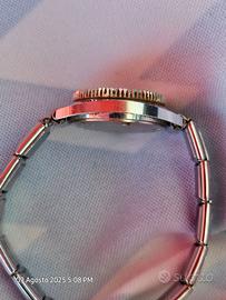 . orologio mini sub avion diver vintage funzionante, prodotto dalla fine anni 60 ei primi anni 70 caratterizzato da quadrante con indici luminosi rettangolari e lancette a bastone, scritta antichoc sul quadrante tipica degli orologi con protezione antiurto, ghiera girevole graduata per immersioni, movimento meccanico a carica manuale, cassa in acciaio cromata 21mm, vetro plexiglass.