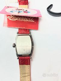 orologio Minnie originale Disney anni 2000, movimento meccanico a carica manuale, cassa acciaio tonneau , quadrante dorato e lancette a forma delle mani .