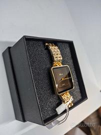 Il design si distingue per la sua essenzialità: il quadrante nero e pulito contrasta con la cassa color oro, creando un look moderno e senza tempo, perfetto per l'ufficio, il tempo libero o un evento elegante. Il vantaggio principale è la sua praticità: