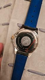 Non ha la sua scatola L'orologio mostrato nell'immagine è un modello Missoni Sport vintage, prodotto in occasione dei Mondiali di Calcio Italia '90. Ecco le caratteristiche principali di questo pezzo da collezione: Design: Si tratta di un orologio subacqueo (diver) con quadrante blu, ghiera girevole e cassa in acciaio inossidabile con dettagli dorati. Dettagli Commemorativi: Il quadrante presenta il logo "Missoni Sport" e, tipicamente, il simbolo ufficiale dei mondiali di Italia '90 posizionato sopra la finestrella della data. Specifiche Tecniche: Movimento: Al quarzo, spesso un calibro svizzero ETA. Resistenza all'acqua: Dichiarata fino a 200 metri (660 ft). Dimensioni: La cassa ha solitamente un diametro di circa 38,5-39 mm. Cinturino: Il modello in foto monta un cinturino in pelle nera