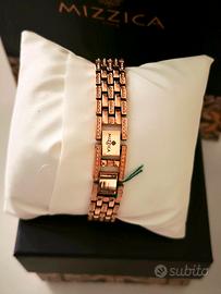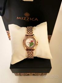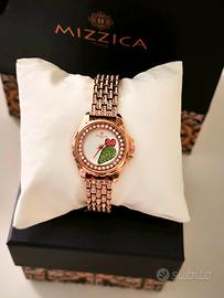 La nuova collezione di orologi Mizzica presenta il "Fico D'lndia" in una nuova maglia e soprattutto con un design diverso dalle precedenti. Un quadrante piccolo e un cinturino in acciaio di colore Rosè Gold. Dimensione: 26 mm Cassa con zirconi: metallo rose con placcatura rose con fondello in acciaio Cinturino in metallo con zirconi: con Placcatura IP Rosè Fibbia: acciaio Rosè Movimento: Giapponese Seiko pc21 Water Resistant: 3 ATM. Nuovo, in confezione originale, mai indossato.