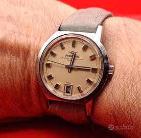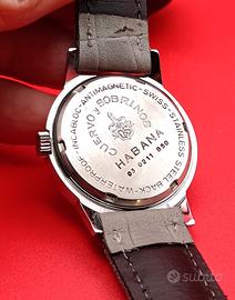 Porto alla vostra attenzione, questo Orologio dell'azienda di orologeria Mondia, impreziosito dal marchio di una gioielleria dell'Avana,Cuba, la quale distribuiva e vendeva orologi di diverse aziende di orologeria come la Rolex, la Longines, la Zenith e altri, aggiungendo il proprio marchio nei quadranti e nei fondelli degli orologi che commercializzava. L'orologio che porto alla vostra attenzione,e un orologio Mondia Cuervo Y Sobrinos a carica manuale con movimento originale, perfettamente funzionante e in ottime condizioni generali. La sua cassa di forma particolare,si presenta in ottime condizioni priva di graffi, la stessa misura 34mm senza considerare la corona di carica, monta la corona originale dell'epoca,il suo vetro si presenta privo di graffi profondi e segni evidenti, molto bello e il suo quadrante color Champagne il quale non presenta nessuna fioritura e nessuna macchia, monta un cinturino in pelle di colore grigio, nuovo,da 18mm con chiusura ad ardiglione, infine monta un fondello in acciaio inox con chiusura a vite nel quale nella parte esterna vi e inciso il marchio Cuervo Y Sobrinos con l'inconfondibile logo. Anche questo orologio appartiene alla mia collezione privata, la vendita si avvale della formula del visto e piaciuto, garantisco personalmente che all'acquirente le verrà consegnato l'ho stesso orologio pubblicato, funzionante,e nelle stesse condizioni visibili nelle foto pubblicate.