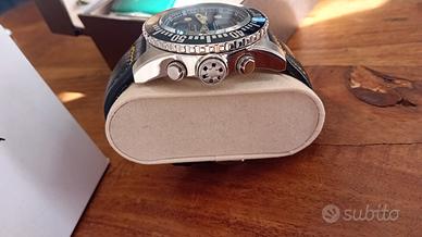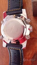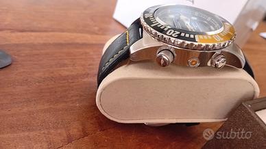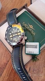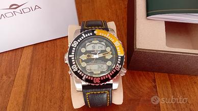 Vendo bellissimo orologio Mondia Dive Depth Meter... referenza 0622... orologio con movimento al quarzo e indicazione analogico/digitale... profondimetro incorporato... w.r. 200 metri... indicazioni digitali di ora, allarme, chrono, registro immersioni e immersione.... cassa in acciaio da 45/47 mm. ... cinturino in pelle nera con cuciture gialle a contrasto.... corona e fondello a vite.... corona e fibbia logate... ghiera unidirezionale bicolore... con scatola e controscatola... praticamente nuovo... mai visto acqua... indossato pochissime volte...
