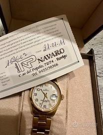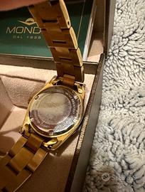 Splendido orologio Mondia (dal 1935), storico marchio dell'orologeria svizzera. Modello elegante e senza tempo, con finitura dorata e quadrante bianco con numeri arabi, perfetto sia per occasioni formali che per un uso quotidiano raffinato. L’orologio Viene venduto come Full Set, ovvero completo di tutto l'originale: Scatola originale Mondia, Libretto di garanzia originale timbrato dal rivenditore italiano (datato 2011), Cinturino originale a maglie.