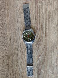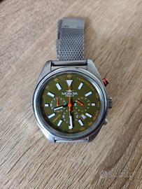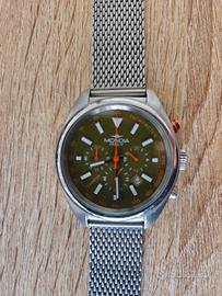 L'orologio è un cronografo della linea Campus del marchio Mondia Italy. Si tratta di un segnatempo caratterizzato da un'estetica sportiva e militare, con un quadrante verde oliva, indici luminescenti e dettagli in arancione vivace. Caratteristiche Principali Movimento: Solitamente monta un movimento al quarzo giapponese (spesso il calibro Miyota OS20). Cassa: Realizzata in acciaio inossidabile con un diametro di circa 40-43 mm. Funzioni: Include un cronografo con tre contatori e la funzione datario posizionata tra le ore 4 e le ore 5. Dettagli: Presenta una scala tachimetrica sul bordo del quadrante e pulsanti laterali, uno dei quali (quello superiore) ha un rivestimento colorato coordinato con le lancette.Cinturino: L'esemplare in foto monta un bracciale a maglia milanese in acciaio, sebbene molti modelli di questa serie siano venduti originariamente con cinturini in nylon (NATO) o canvas.Il marchio Mondia Italy è noto per produrre orologi che combinano il design italiano con movimenti affidabili, offrendo un buon rapporto qualità prezzo. N.b. non trovo lo scatolo