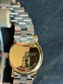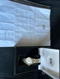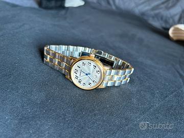 Orologio elegante in acciaio e oro, movimento al quarzo, perfettamente funzionante. Completo di scatola originale Montblanc e documento di intervento ufficiale (Richemont Italia). Condizioni molto buone, normali segni d'uso. Diametro circa 32 mm, ideale anche come orologio classico/unisex. Seriale presente e corrispondente ai documenti. L’intervento e stato fatto per aggiungere maglie al cinturino
