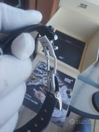 Vendo ad un prezzo affare ...splendido Montblanc TimeWalker Chronograph Automatic, referenza 116098. Un orologio sportivo ed elegante, ispirato al mondo delle corse automobilistiche, perfetto per ogni occasione. L'orologio si presenta in ottime condizioni ed è completo di tutto il suo corredo originale: scatola, controscatola, libretti e garanzia ufficiale Montblanc del 2018. Il quadrante "reverse panda" (nero con contatori argento a contrasto) è magnifico, con dettagli rossi, tra cui la lancetta centrale del cronografo, che gli conferiscono un carattere deciso. La cassa in acciaio da 43 mm è robusta e la lunetta fissa in ceramica nera con scala tachimetrica è inscalfibile. Monta il cinturino originale in pelle nera traforata "rally" con chiusura deployante originale Montblanc. Disponibile per qualsiasi prova o visione di persona a Bologna. Dettagli Tecnici: Marca: Montblanc Modello: TimeWalker Chronograph Automatic Referenza: 116098 Movimento: Automatico Calibro Montblanc MB 25.07 (cronografo) Cassa: Acciaio inossidabile Diametro: 43 mm Quadrante: Nero con contatori argento ("Reverse Panda") Vetro: Zaffiro bombato con trattamento antiriflesso Lunetta: Ceramica nera con scala tachimetrica Cinturino: Pelle nera traforata originale Montblanc Chiusura: Deployante originale Montblanc Corredo: Full Set (Scatola, controscatola, garanzia e manuali)