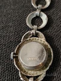 Lunghezza totale cm. 16,la cassa misura cm. 2.5 di diametro, il quadrante cm. 1, 6, sul retro della cassa è presente il punzone 0.800, peso g. 21,8. Risale agli anni '50, le condizioni del vetro e del quadrante sono perfette, senza graffi né macchie. La corona muove le lancette ma l' orologio NON è funzionante.
