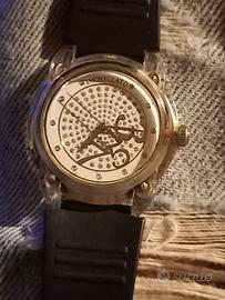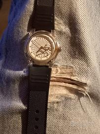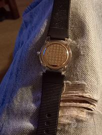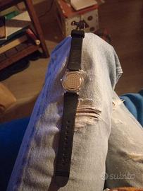 Elegante orologio da polso con cinturino nero e cassa argentata.