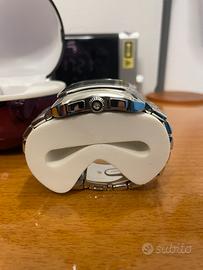orologio di forma in acciaio 36mm X 43mm , movimento cronografico al quartz, bracciale acciaio con chiusura deployante a pulsanti, diamante incastonato sulla corona di regolazione, water resistant 5 atm