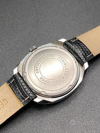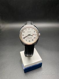 Orologio Mortima Mayerling in perfette condizioni. Movimento meccanico a carica manuale Cattin C66. Perfettamente funzionante. Bilanciere appena sostituito. Dial bianco con indici a numeri arabi neri. Sfere nere. Datario ad ore tre. Vetro con lente magnificatrice. Misura cassa escluso corona 35 mm. Fondello in acciaio inossidabile a vite. Cinturino in pelle nero.