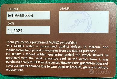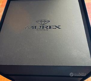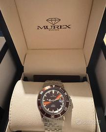 Sportivo ed elegante orologio MUREX-X LINE, cassa 42mm con vetro zaffiro, fondello a vista con meccanismo automatico svizzero. WR 50mt. Dial marrone con ghiera unidirezionale marrone e numer in argento. Inserti e lancette in acciaio con bianco luminescente, data alle ore 3. Fondello a vite con vetro trasparente e meccanismo automatico svizzero a vista. Bracciale in acciaio. Orologio full det con garanzia di 2 anni dal valore di stima al dettaglio dalle 850/950€. vendo a meno della meta del prezzo di stima.