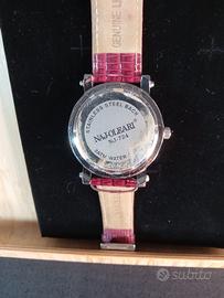 Bellissimo orologio anni 80 di Naj Oleari con cinturino in pelle rossa. Numeri particolari e doppia ghiera di brillanti (non so se veri) intorno ai numeri. Si deve solo cambiare la pila. introvabile e molto originale.