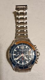 Orologio uomo Nautica in acciaio inossidabile secondo polso. Chiusura pieghevole. Cassa in acciaio di 45 mm e quadrante con fondo blu con datario. Cinturino in acciaio. Vetro minerale. Movimento al quarzo, cronografo. Ref: A26535G