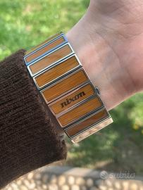 Cassa e bracciale con inserti color legno e finitura in metallo di colore argento.