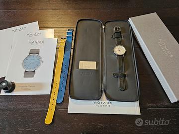 Vendo Orologio Nomos Tangente Neomatik ref. 140 in condizioni pari al nuovo (acquistato febbraio 2024), causa passaggio a stesso orologio versione oro. Sono molto contento della qualità e manifattura di questa marca. Il segnatempo, come visibile dalle foto, non presenta graffi di alcun tipo e il movimento è perfetto. Annesso includo la confezione e custodia originale, certificato di garanzia, cinturno in pelle Cordovan originale e due altri cinturini Nato acquistati da me, perfetti per l’estate. Essendo un appassionato, mi piace ruotare la mia collezione a cadenza annuale e purtroppo non posso tenere tutti gli orologi che compro.