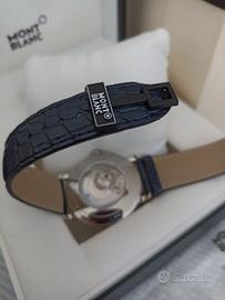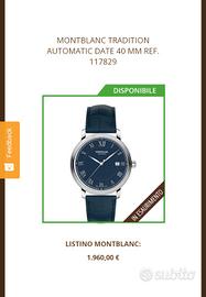 Vendo orologio Montblanc originale modello "Tradition Automatic Date", nuovo e mai indossato. L'orologio ha una cassa in acciaio pregiato di 40 mm che presenta le tipiche anse diritte Mont Blanc e una caratteristica lunetta doppia con vetro zaffiro bombato. Il quadrante è blu con numeri romani e un imponente numero romano "XII". La tradizionale minuteria "chemin de fer" e le classiche lancette a foglia e a bastone completano il look elegante. Prezzo di listino 1960,00. No perditempo.