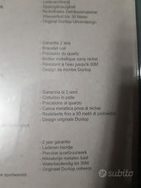 DA COLLEZIONE PRIVATA VENDO SINGOLARMENTE O IN COPPIA OROLOGI OROLOGIO VINTAGE SPORTIVO AL QUARZO NUOVO DUNLOP ISPIRATO AL MOTORSPORT ED ADATTO ALLO SPORT GRAZIE ALLA CASSA METALLICA DUREVOLE CON GHIERA ROTANTE A SENSO UNICO PER MISURARE E MONITORARE IL TEMPO TRASCORSO. INDICE E LANCETTE LUMINOSE PER LA VISTA AL BUIO. CINTURINO IN PELLE E CASSA METALLICA PRIVA DI NICHEL OLTRE AD ESSERE RESISTENTE FINO A 30 METRI DI PROFONDITA’ DESIGN INNOVATO ED ORIGINALE DUNLOP STUDIATO PER LO SPORT ED IL MOTORSPORT. GLI OROLOGI SONO NUOVI ED ANCORA NELLA LORO CONFEZIONE ORIGINALE DEL TEMPO MAI APERTA DOVE E’ PRESENTE ANCHE LA VECCHIA GARANZIA DELL’EPOCA. OROLOGIO DI PARECCHI ANNI FA NON PIU’ IN PRODUZIONE DA ANNI, OGGETTO DA COLLEZIONE INTROVABILE IN QUESTO STATO ANCORA IMBALLATO E DI SICURA RIVALUTAZIONE PER CHI LI COLLEZIONA MA ANCHE ADATTO DA ESSERE PORTATO TUTTI I GIORNI. UNO ELEGANTE BLU CON CINTURINO E CASSA BLU MENTRE L’ALTRO PIU’ SPORTIVO NERO. EURO 59 PER SINGOLO OROLOGIO. VALUTO SCONTO PER ENTRAMBI. OTTIMO COME REGALO O PERFETTO PER GLI APPASSIONATI DEL MOTORSPORT O PER CHI PRATICA CICLISMO MOTOCICLISMO NUOTO RUNNING CALCIO AUTOMOBILISMO ECC